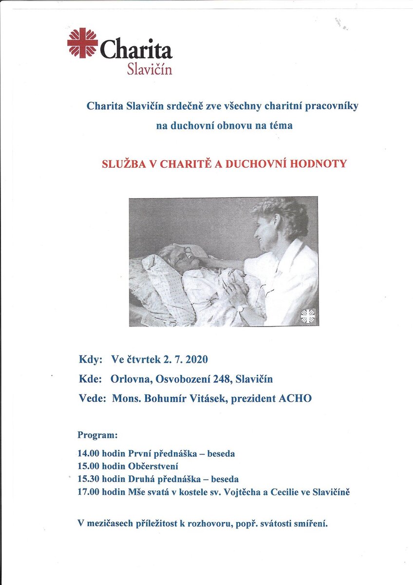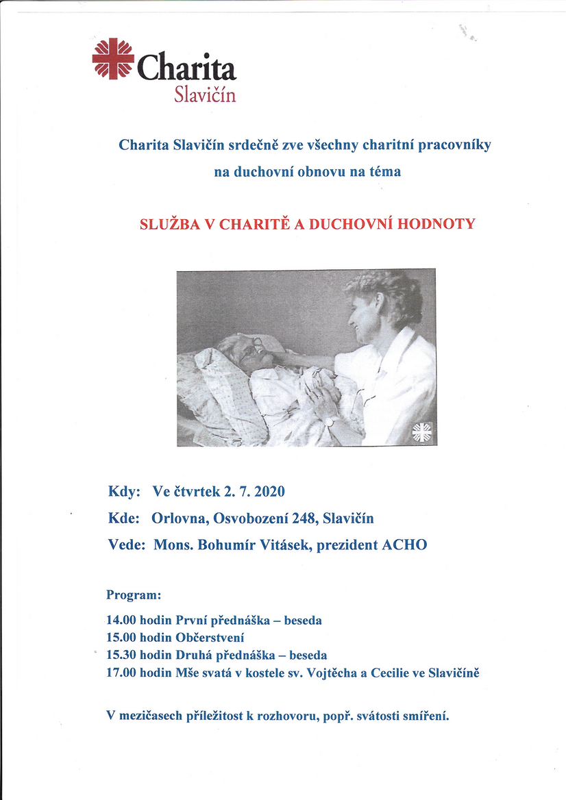 Ve Slavičíně se sejdou na duchovní obnovu charity z celého valašskoklobuckého děkanátu ( Charita Luhačovice, Charita Slavičín a Charita Valašské Klobouky)